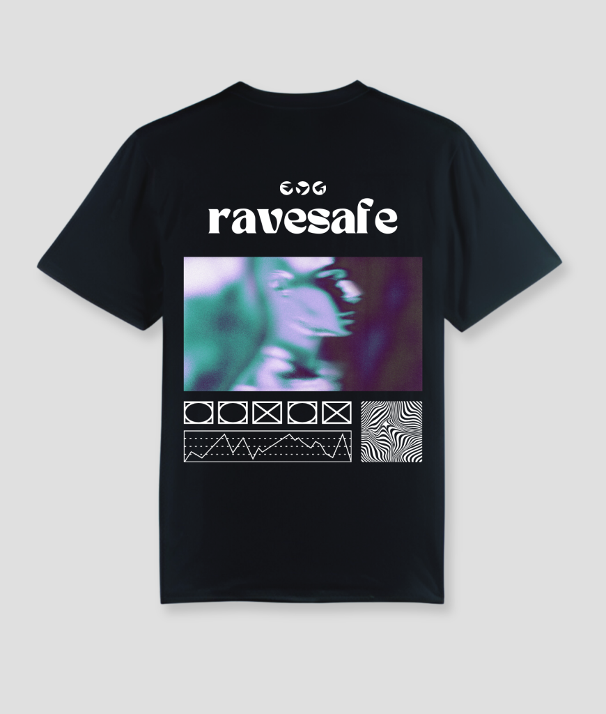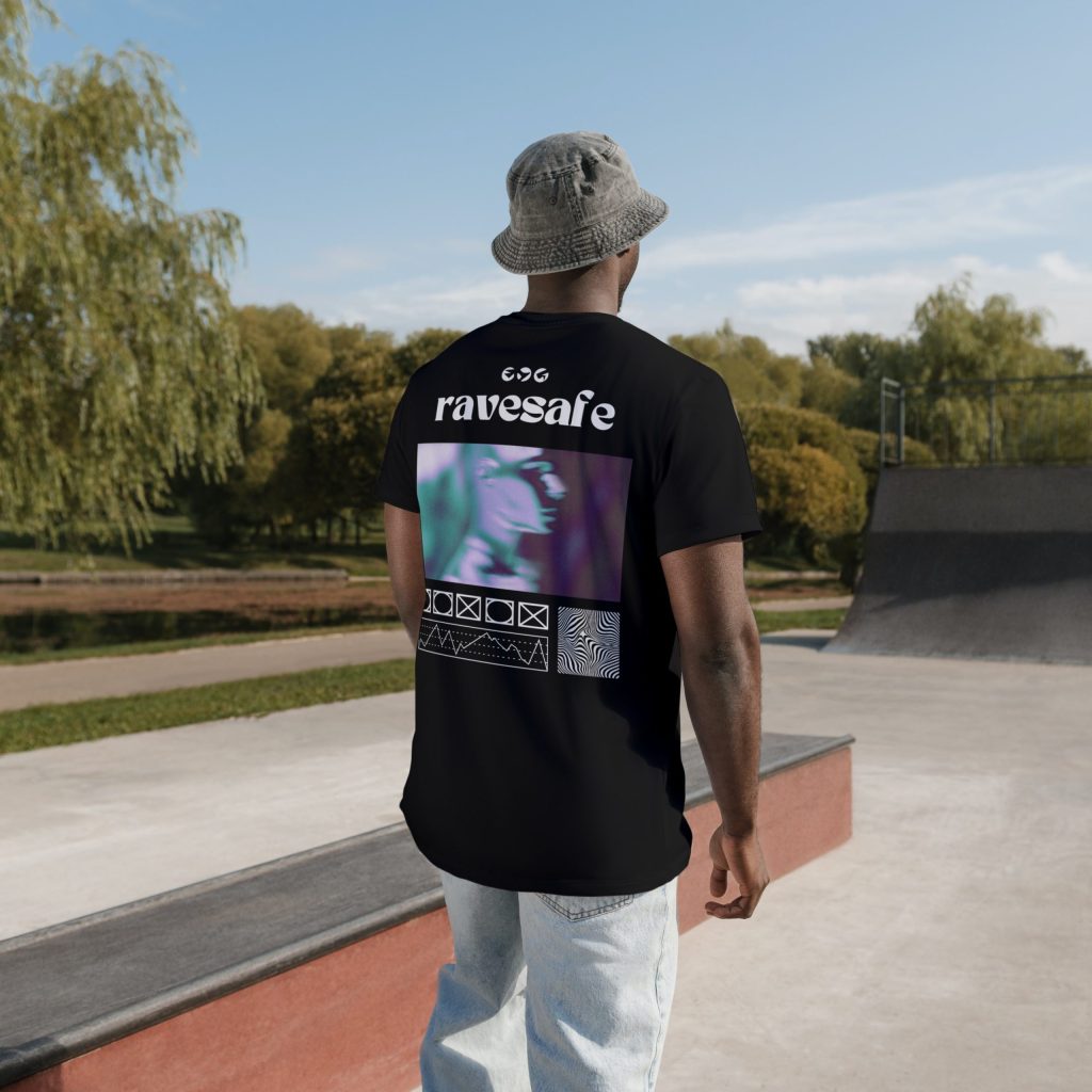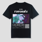 Uniek shirt met de tekst ravesafe op de achterkant, ideaal voor naar een festival of grimmige rave.