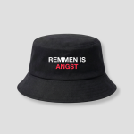Het is een zwarte bucket hat van stevige stof die goed in model blijft. De tekst “Remmen is angst” staat duidelijk op de voorkant gedrukt, met het woord “angst” in rood voor extra contrast.