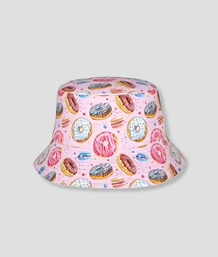 Denk aan vitrinekast bij je favoriete nachtelijke bakkertje, maar dan op je hoofd. Ronde donuts met verschillende toppings en kleuren, alsof ze elk een eigen track zijn in de line-up. De print is retro zonder oud te worden, zoet zonder klef te doen. Op de techno stage vang je stroboscooplicht als een discobal met suikerlaag, bij hardstyle ben je het herkenningspunt dat iedereen onthoudt, en in de nachtbus glimlacht zelfs de chauffeur. De boodschap is simpel: jij bent hier om het leuk te maken—voor jezelf en voor de rest.