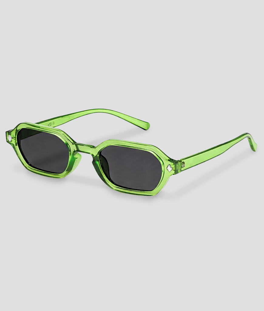 Zonnebril met smal model, transparant groen frame en donkere glazen. Licht en opvallend.