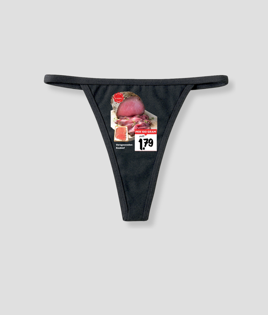 Compact, sappig en klaar om van te genieten. Deze rosbief-string is een knipoog voor iedereen met een beetje bruut gevoel voor humor. Een grapje dat zó flauw is dat ’ie weer leuk wordt.