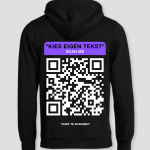 Met de KIES EIGEN TEKST optie kun je de QR-code volledig aanpassen. Of je nu een link, grappige boodschap of iets anders wilt delen, de keuze is aan jou. Het is de perfecte manier om je hoodie persoonlijk te maken en tegelijkertijd nieuwsgierigheid op te wekken.