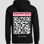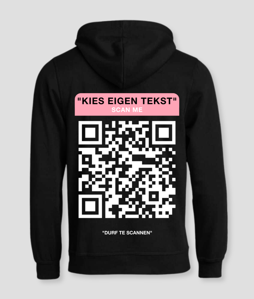 Met de KIES EIGEN TEKST optie kun je de QR-code volledig aanpassen. Of je nu een link, grappige boodschap of iets anders wilt delen, de keuze is aan jou. Het is de perfecte manier om je hoodie persoonlijk te maken en tegelijkertijd nieuwsgierigheid op te wekken.