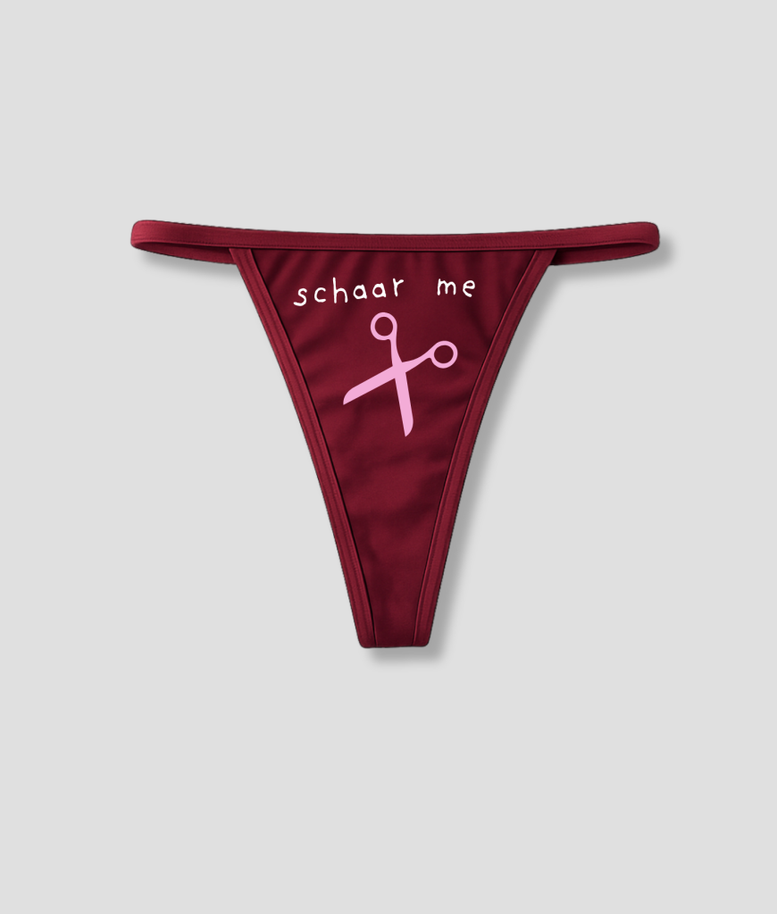 Op de string staat “schaar me” met een schaar-icoon. De grap landt meteen. Wie ’m ziet, snapt ’m. Geen uitleg nodig.
