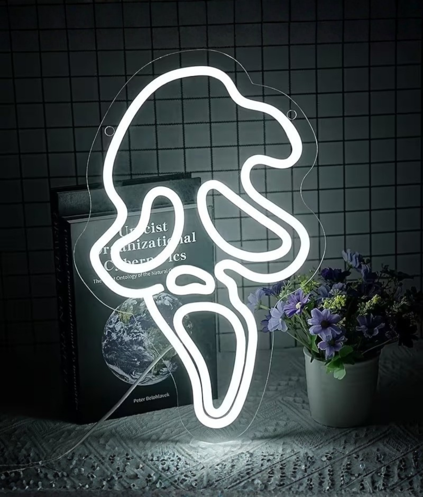 Deze Scream neon is een lichtbord dat meteen je aandacht pakt. Het herkenbare masker zorgt voor een speelse griezel vibe zonder dat het te heftig wordt. Door het heldere witte licht past het bord goed in slaapkamers, gamehoeken en feestsettings.