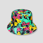 Deze bucket hat is een waarschuwing en een uitnodiging tegelijk. Neonkleuren knallen—turquoise, zonnig geel, fel roze—met haaienprints die lachen alsof ze de moshpit al hebben geroken. Je zet ’m op en je look krijgt direct bite. Niet netjes, wel nodig. Perfect voor nachten die uitlopen en festivals waar jij de eerste bent die het water test.