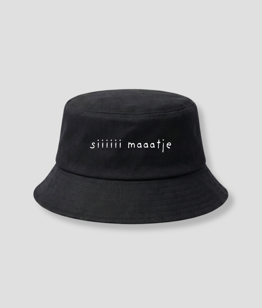 Zwarte bucket hat met de tekst “siiiii maatje” in witte print. Simpel model, grappige tekst en makkelijk te dragen op een feestje of festival.