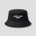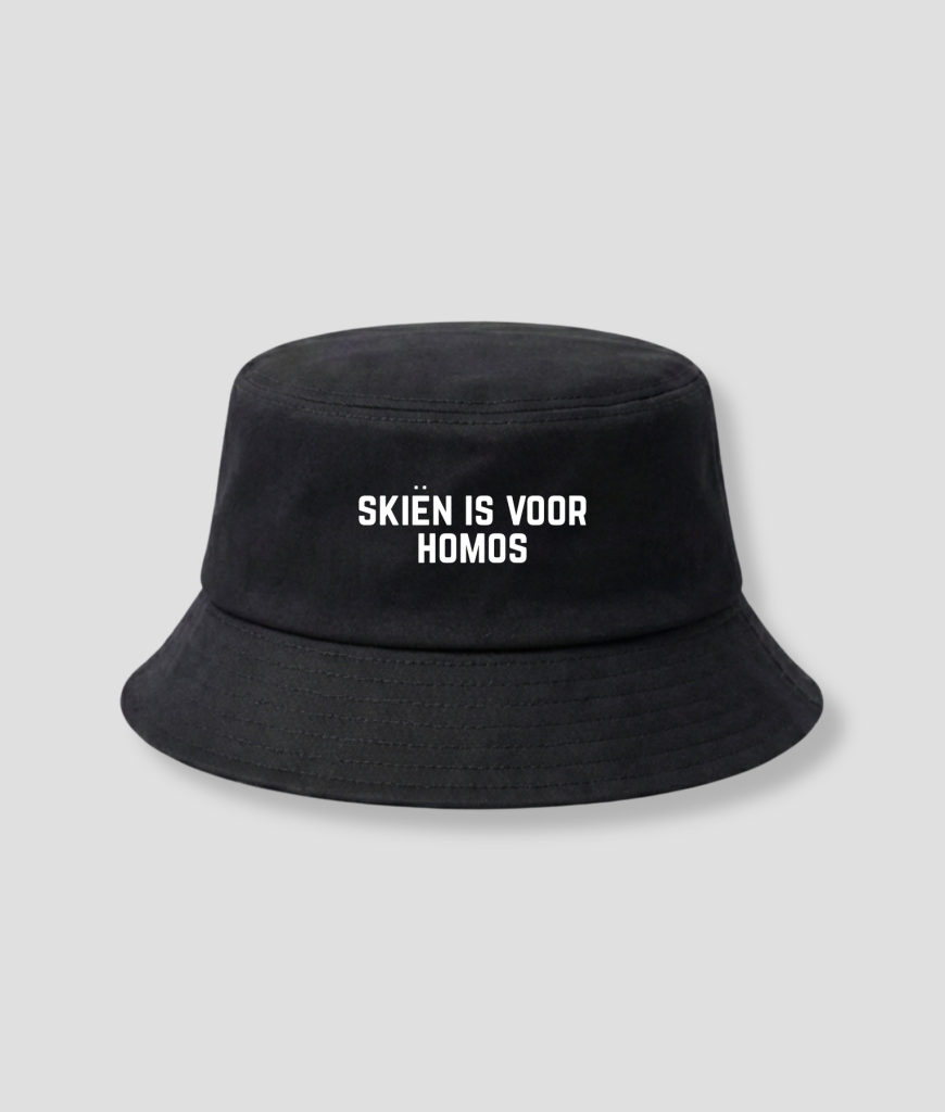 Deze zwarte bucket hat met de tekst “Skiën is voorhomos” is bedoeld als grap tussen snowboarders en skiërs. De witte print op de zwarte stof valt goed op en zorgt direct voor discussie in de skilift.