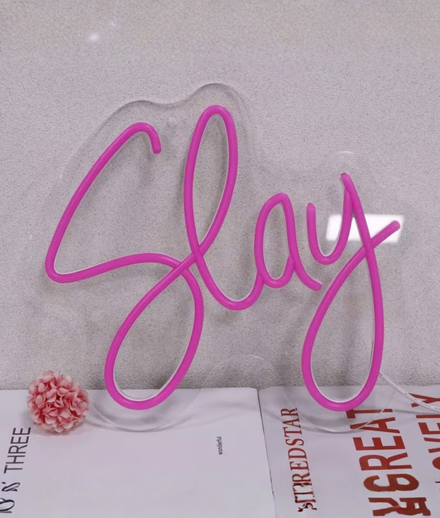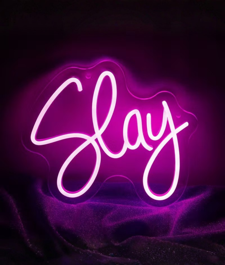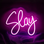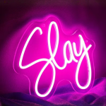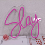 Slay. Meer hoef je eigenlijk niet te zeggen. De letters lopen in een vloeiende scriptstijl over je muur, alsof iemand met één soepele beweging een handtekening heeft gezet onder jouw lifestyle. De lijnen zijn scherp maar speels, de roze lichtlaag eromheen geeft dat zachte aura dat je kent van avondfoto’s op Insta. Iedereen die binnenkomt ziet het meteen: hier woont geen grijze muis, hier woont een legende die weet hoe je een entrée maakt, zelfs in eigen kamer.