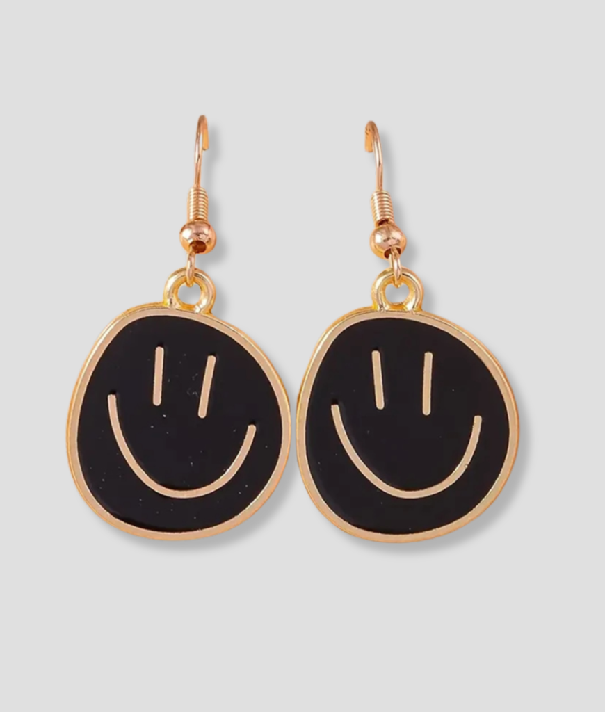 `Zwarte smiley oorbellen, voor de vrolijke ravers onder ons.