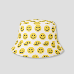 Witte bucket hat met vrolijke gele smileys. Comfortabel, opvallend en perfect om elke outfit een speelse touch te geven.