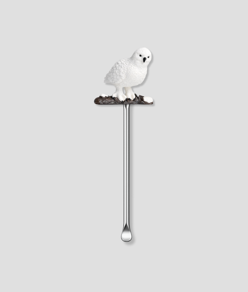 Het figuur bovenop geeft dit schepje een eigen uitstraling zonder dat het druk wordt. Het oogt strak, voelt stevig en past net zo goed op tafel als in je zak.