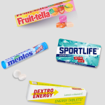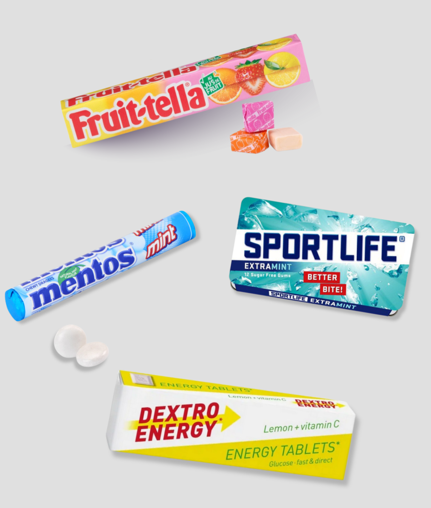 Snoep rave pakket met Fruit-tella, Mentos, Sportlife en Dextro Energy. Alles wat je nodig hebt voor een lange nacht knallen.