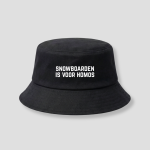Zwarte bucket hat met “Snowboarden is voor homos” print