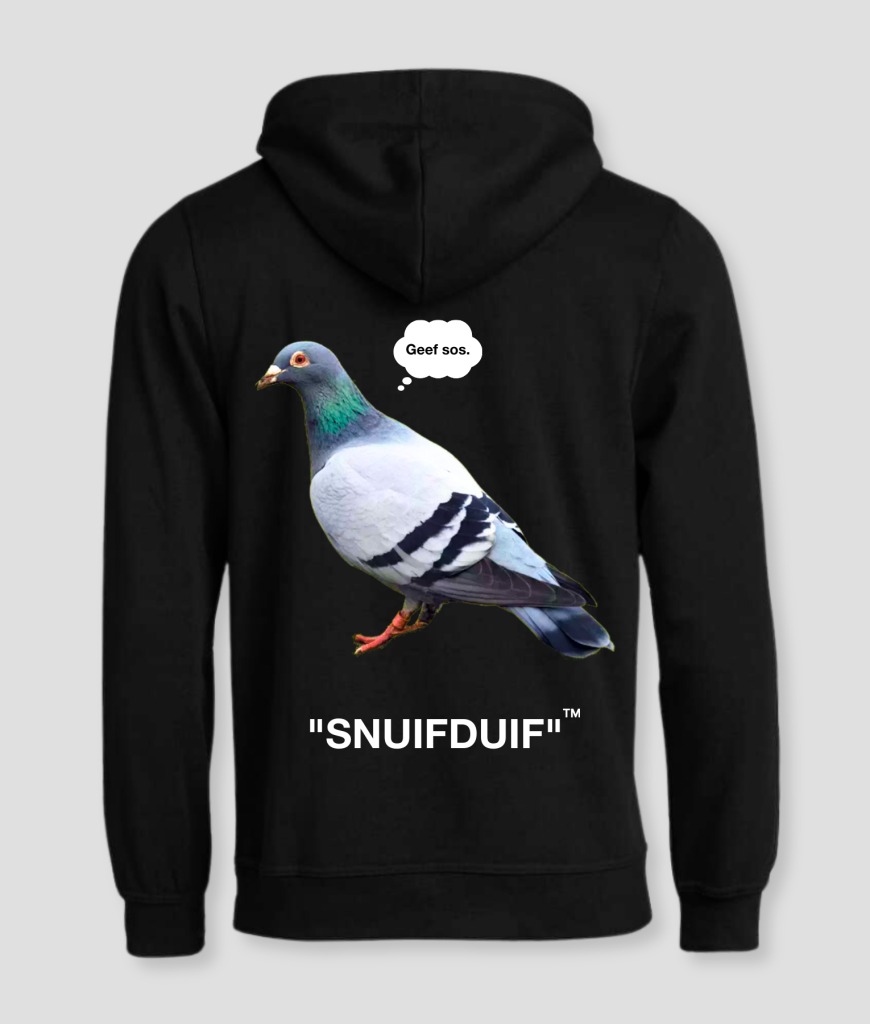 De Duif Hoodie heeft een minimalistisch zwart ontwerp, maar wordt echt opvallend door de gedurfde duifprint op de achterkant. De duif wordt vergezeld door een spreekwolkje met de tekst “Geef sos.”, wat de hoodie een grappige en speelse uitstraling geeft. Dit maakt het een perfecte keuze voor mensen die hun humor en stijl willen combineren.