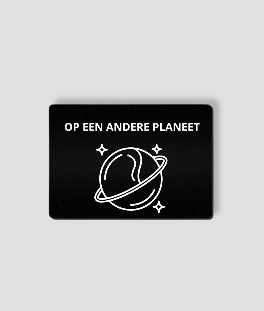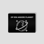 Het ontwerp is strak en minimalistisch. Een zwarte achtergrond met een witte lijnillustratie van een planeet en sterren. De tekst is kort en duidelijk, zonder uitleg nodig te hebben. Dit zorgt voor een rustige uitstraling die toch meteen opvalt. Het voelt een beetje buiten de standaard, maar blijft clean en leesbaar.
