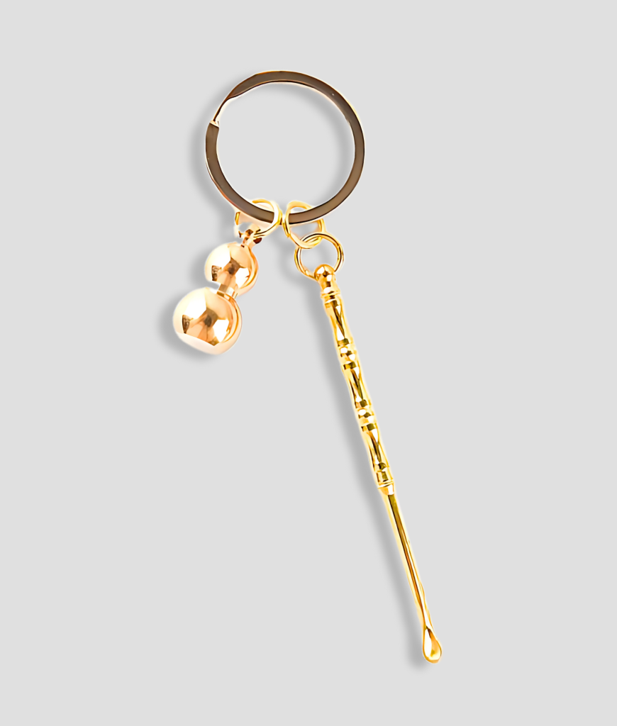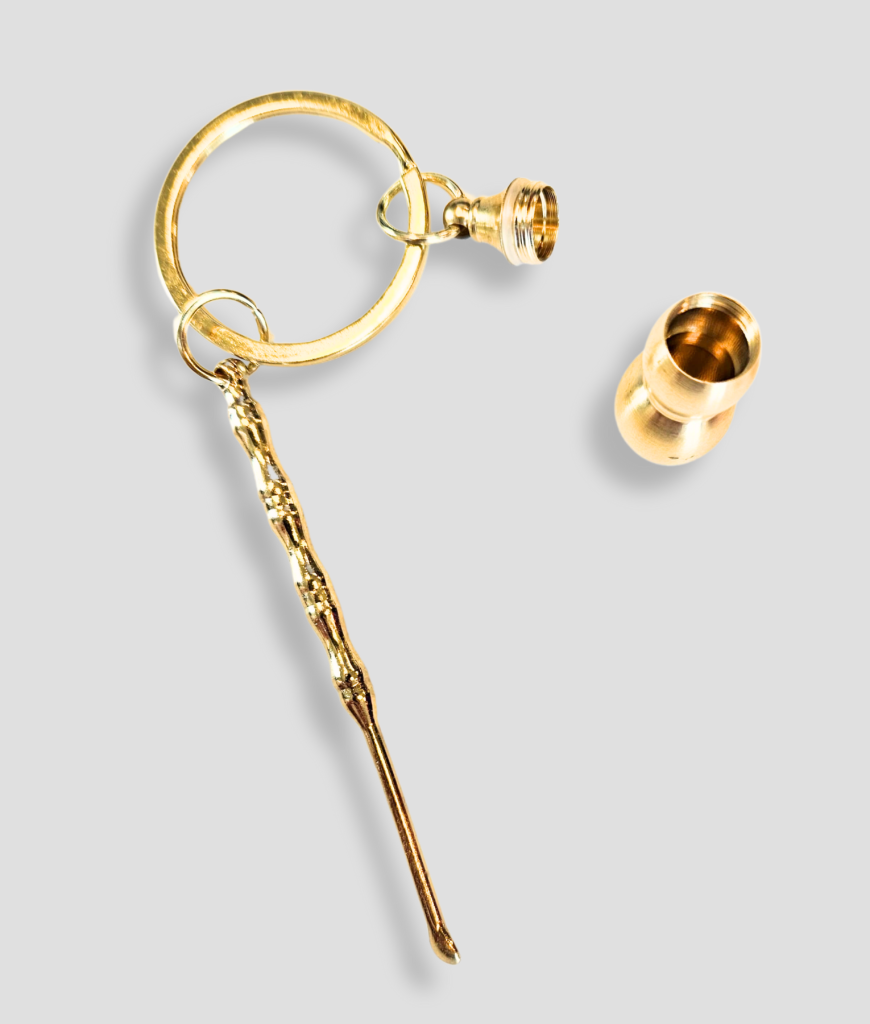 Deze gouden schep heeft een stash voorraadje er aan hangen. Je kunt hier je zooi in stoppen en zo alles netjes bij elkaar houden. Het potje biedt genoeg ruimte en is ook nog eens spatwaterdicht. Schep en stash in een dus, ideaal voor je volgende sessie.