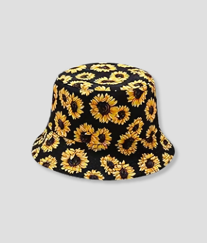 Zwart canvas met een veld vol zonnebloemen: jij loopt binnen en het wordt meteen lichter. Deze bucket hat geeft je outfit die zomerse kick, of je nu naar een day-rave in het park gaat, een techno sunset meepakt of de nacht uitzwaait op de fiets. Vrolijk zonder klef te worden, speels zonder kinderachtig—gewoon frisse drip voor mensen die niet voor half werk gaan.