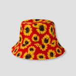 Rood als een warme zonsondergang, met volle gele bloemen die knallen alsof het golden hour vastgeplakt zit aan stof. Van afstand clean en herkenbaar, van dichtbij zie je de hartjes van de bloemen het licht vangen. Het is die look die het festival seizoen snapt: zomerenergie in een club, kleur in een grijze rij, warmte op een winderig perron. Je hoeft niets te zeggen—de hoed praat voor je.
