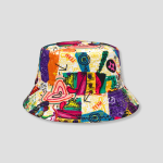 Deze bucket hat is alsof een galerie is losgebroken op je hoofd. Blokken feloranje, paars en limoengroen wisselen elkaar af, lijnen krullen als notities van een nacht die te mooi was om te slapen, en hier en daar duikt een speels motief op dat je pas ziet als de spots goed vallen. Je zet ’m op en je outfit krijgt meteen die creatieve swagger: niet netjes, wel geniaal. Dit is de vibe van iemand die de dansvloer gebruikt als canvas.