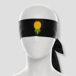 Dit is een zwarte blinddoek met een ananas op de voorkant. Geen tekst, geen uitleg. Gewoon een duidelijke print die meteen iets suggereert. De blinddoek wordt vastgeknoopt met linten aan de achterkant en bedekt de ogen volledig.