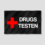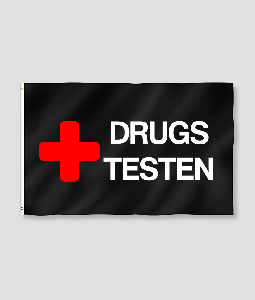 Functionaliteit is noodzaak. Dit is de vlag die je eist om je territorium mee af te bakenen. Je kunt hem “om je heen hangen of bindt hem vast aan je tent of partytent”. Het doel is helder: “maak een statement op die grimmige festival camping”. Met de vlag schreeuw je de boodschap “DRUGS TESTEN” en neem je de leiding.