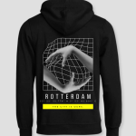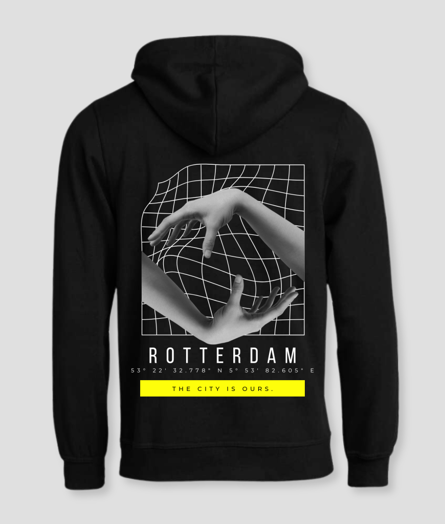 De Eigen Stad Hoodie heeft een gedurfd ontwerp dat stadscultuur en futurisme combineert. Het ontwerp toont twee handen die in een abstracte digitale ruimte elkaar vinden, omringd door een grafische grid en coördinaten van de stad. De boodschap “THE CITY IS OURS” onderstreept het thema van eigenaarschap en invloed in de stedelijke ruimte.