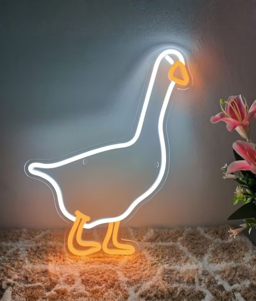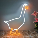 The Goose Neon brengt een eigenwijze gans in lichtvorm je kamer binnen. Het witte lijf met warme oranje details trekt meteen aandacht en geeft je ruimte een speelse glow. Perfect voor iedereen die houdt van humor in huis en een lamp zoekt die net even anders is.