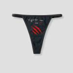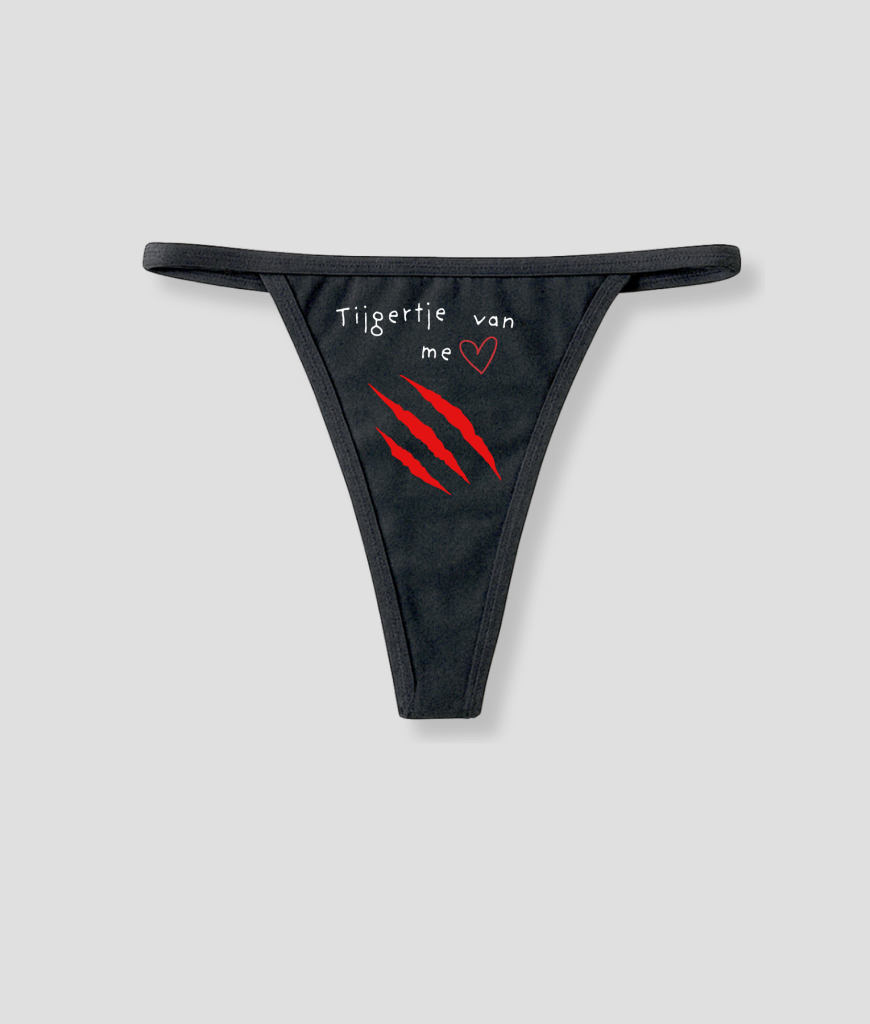 Deze zwarte dames string heeft de tekst “Tijgertje van me” in wit, gecombineerd met rode krassen op de voorkant. De print valt direct op en geeft de string een stoere, speelse uitstraling.
