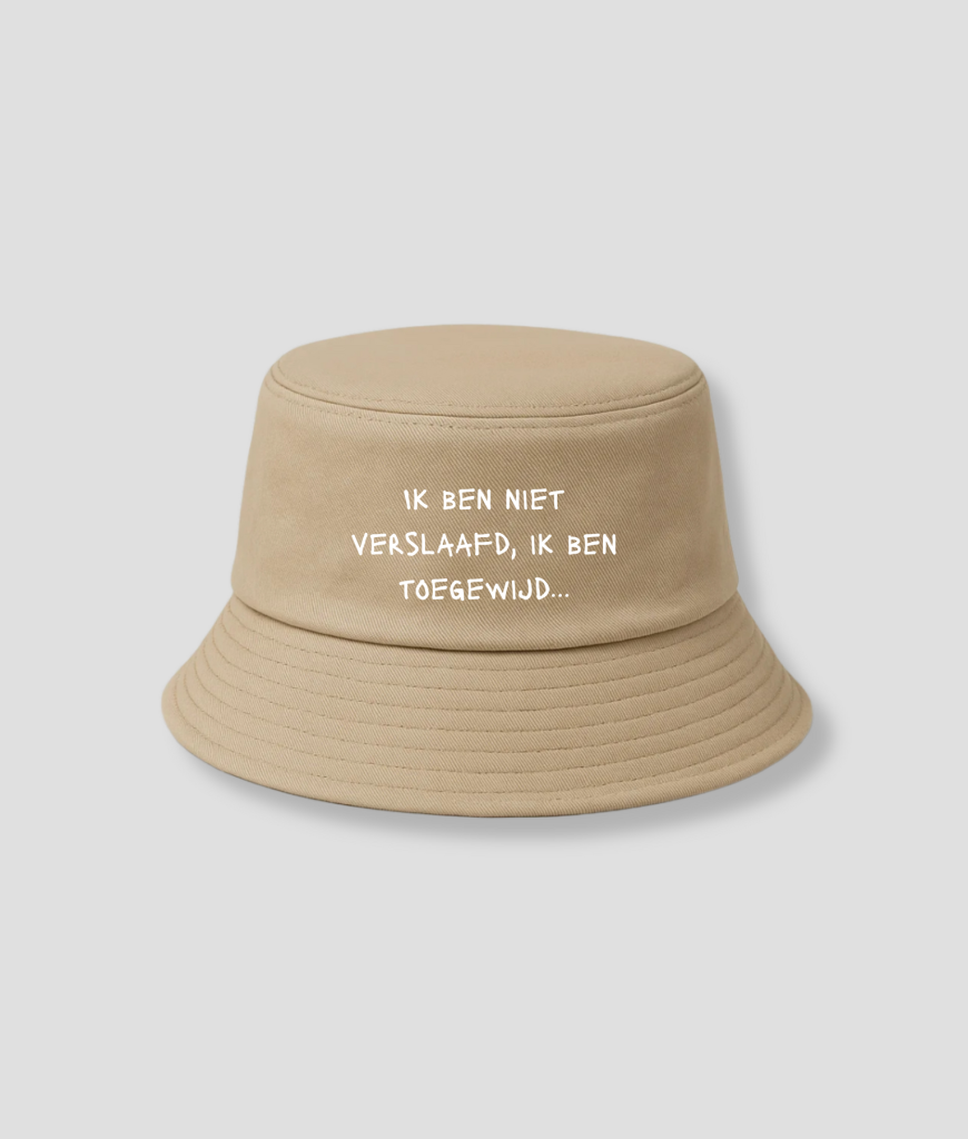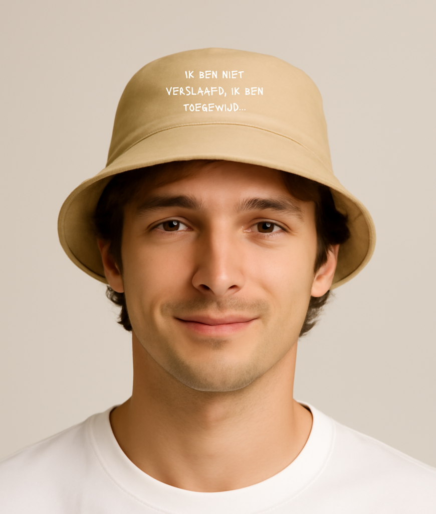 Deze bucket hat met de tekst “Ik ben niet verslaafd, ik ben toegewijd” is perfect voor iedereen die net iets té fanatiek is met koffie, sporten, series bingewatchen, of wat dan ook. Want toegewijd zijn is geen probleem… toch?