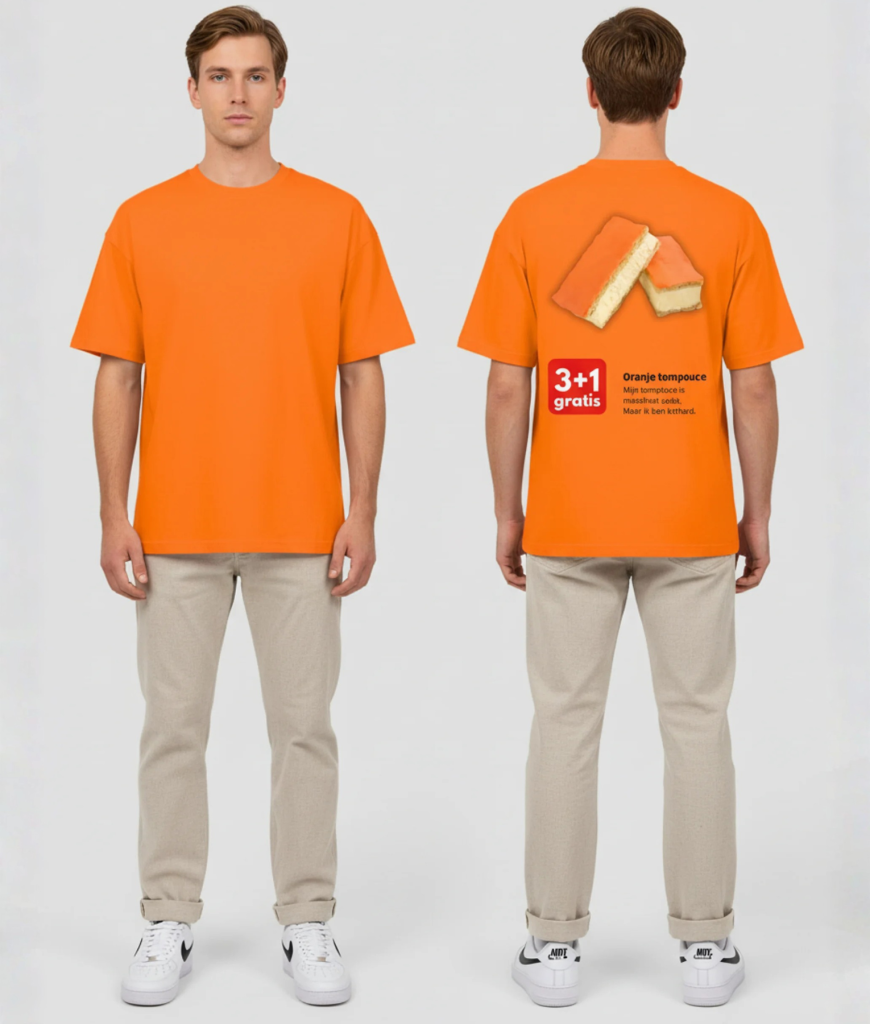 Tompouce Shirt is een ode aan hét ultieme Koningsdag-snackje: de oranje tompouce. Met een knipoog naar zoetigheid en traditie, is dit shirt perfect voor wie stijl en feest graag combineert.
