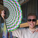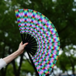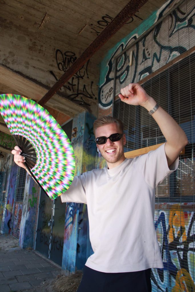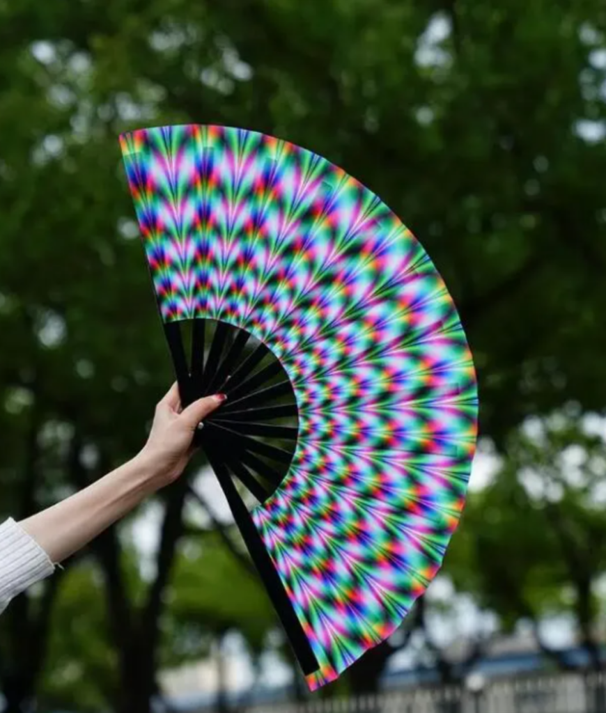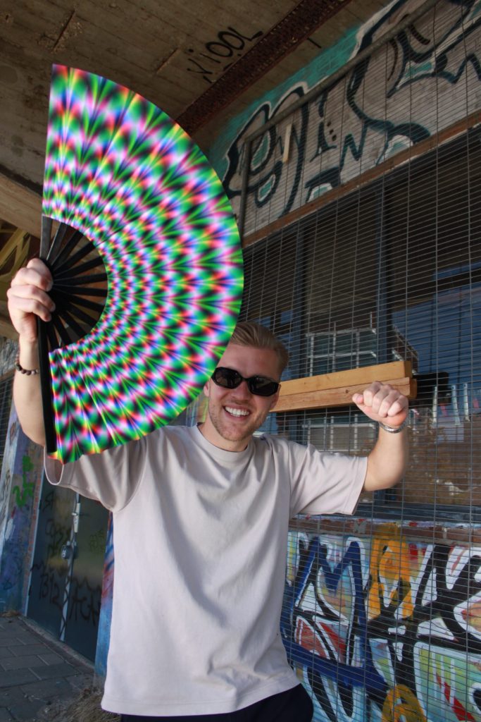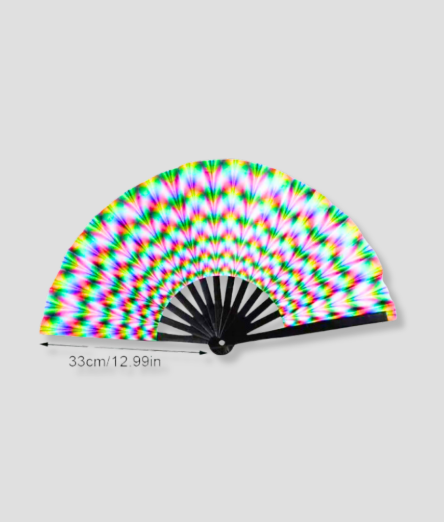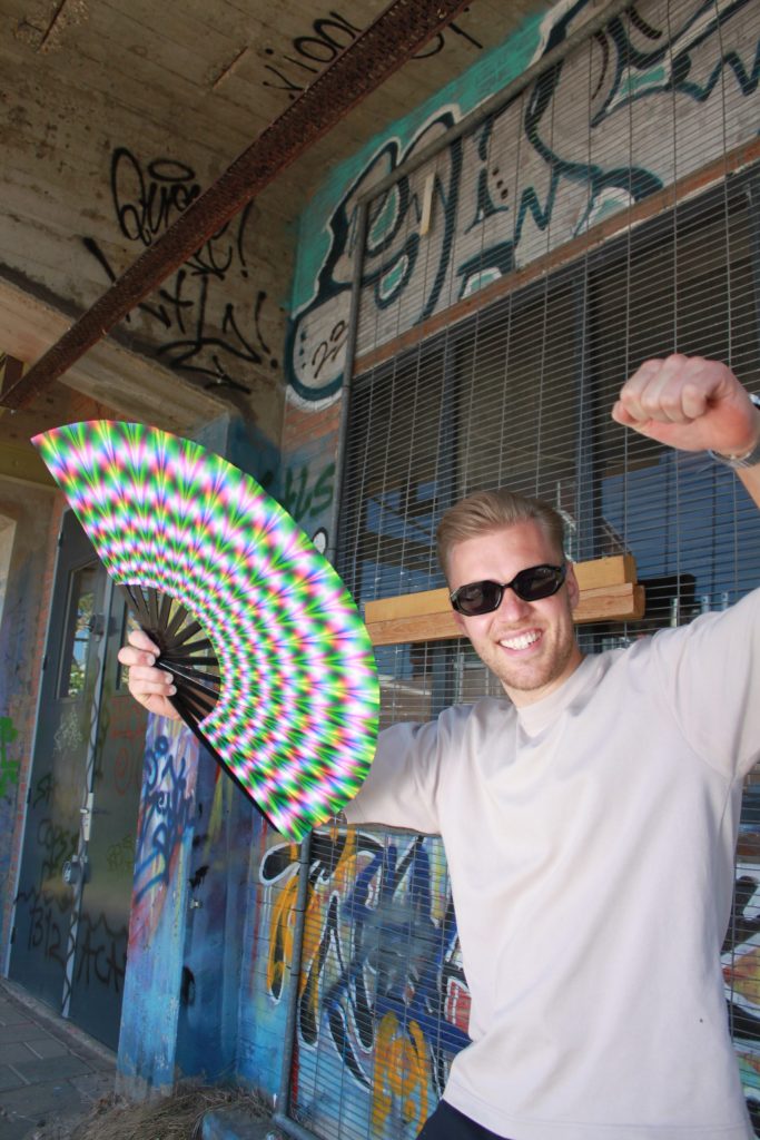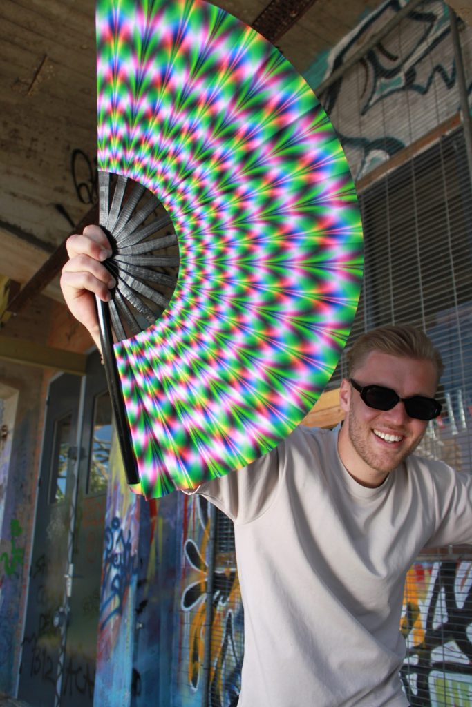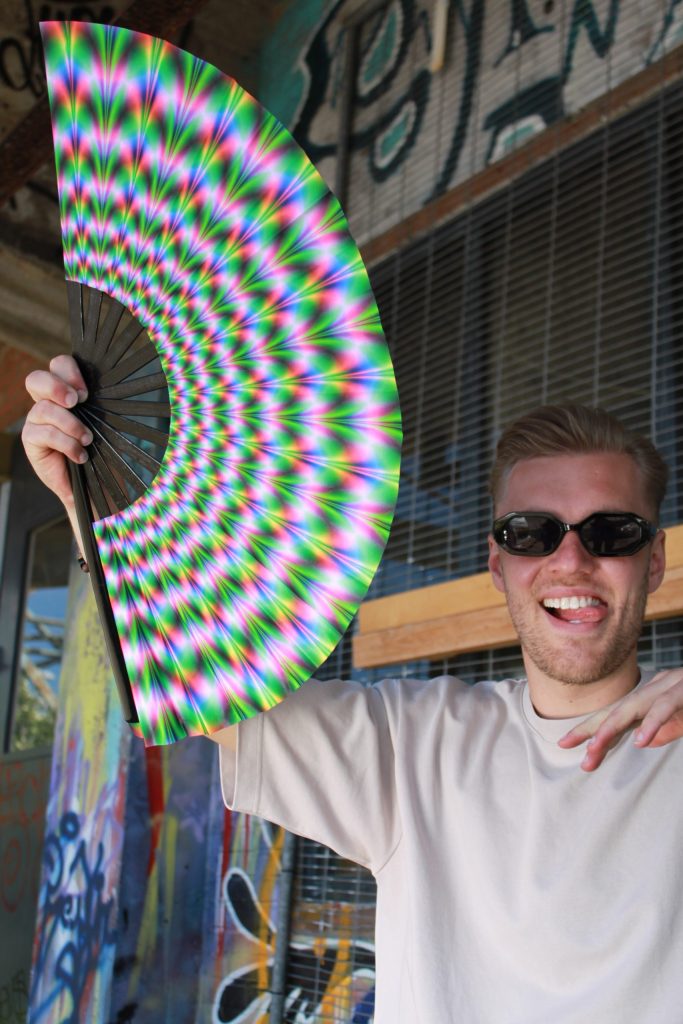 Deze waaier ziet er al trippy uit voordat je aan de zooi zit, laat staan als je pas echt lekker gaat. Extra stevig materiaal en kan tegen water en vocht. Bovendien wapper je jezelf en je vrienden lekker koel als je vooraan staat te rammen.