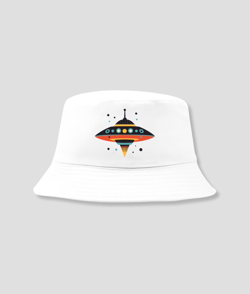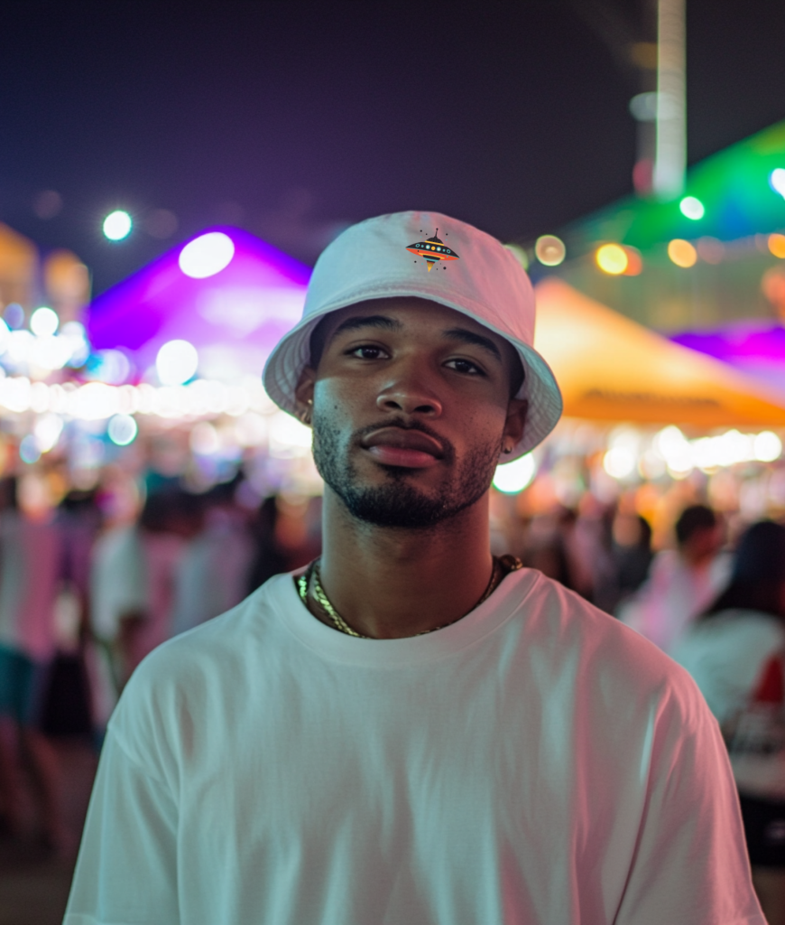 Je stapt de club in, lasers tekenen streepjes in de rook en jij landt midden op de dansvloer. UFO op je hoofd en je outfit is gelanceerd. Witte bucket, kleurrijke flying saucer voorop, precies die mix van humor en mysterie die past bij nachten die langer duren dan gepland. Jij gaat niet voor half werk in het weekend, amigo. Jij kiest je eigen baan langs de sterren en neemt je crew mee.