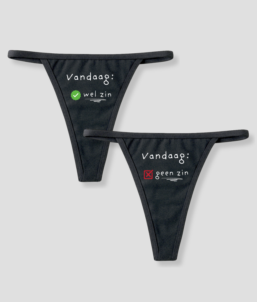 Set van twee zwarte strings met de tekst “Vandaag: wel zin” en “Vandaag: geen zin”. Zo heb je altijd de juiste optie voor je mood.