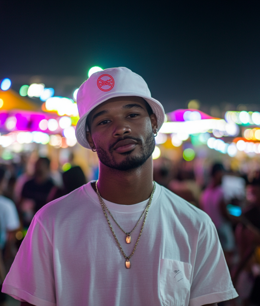 Je loopt het terrein op, zon in je gezicht, bas in je borst. Op je hoofd: Verboden. Witte bucket, rood pictogram met een duidelijke knik-nope. Geen preek, gewoon een principe. Jij komt voor muziek, vrienden en verhalen — niet voor gedoe. Dat leest iedereen meteen van je af. Van techno-kelder tot hardstyle main, van clubnacht naar rooftop after: jij houdt het scherp, amigo. Jij gaat niet voor half werk in het weekend.