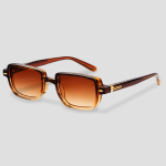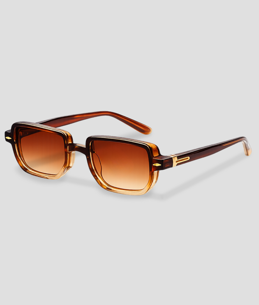 Zonnebril met vierkante glazen en bruine verlooplenzen. Stevig frame en warme kleur.