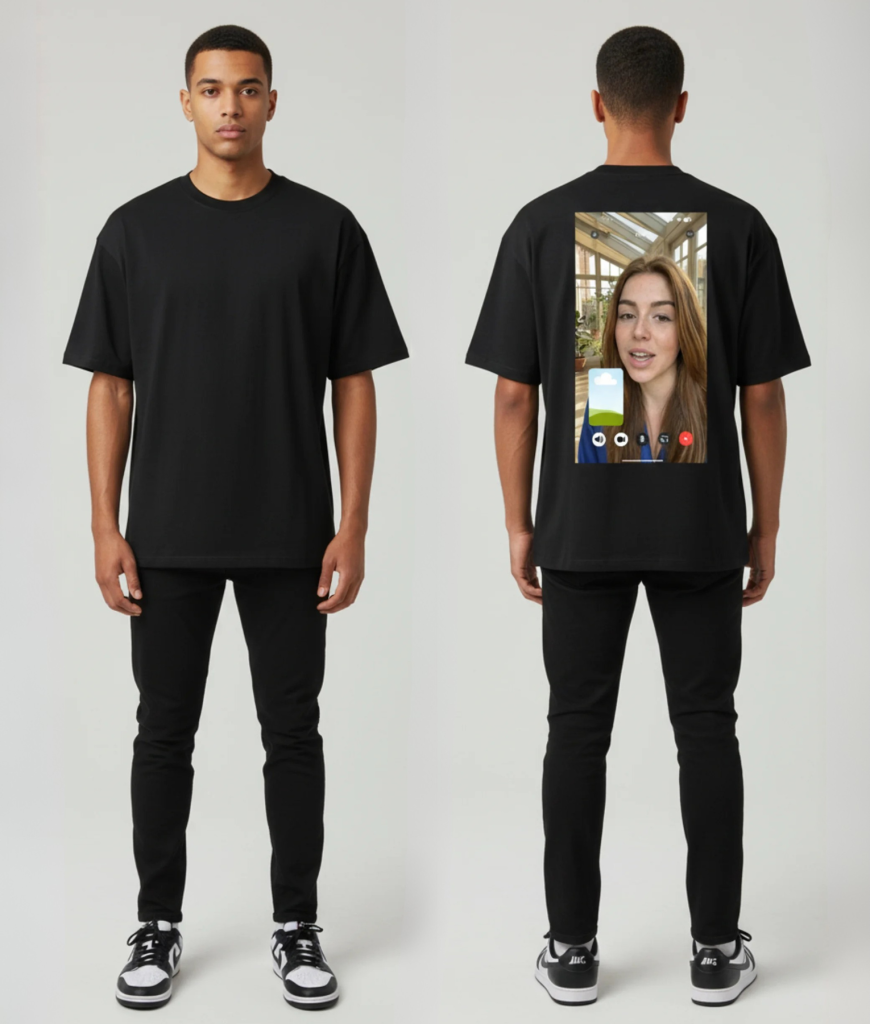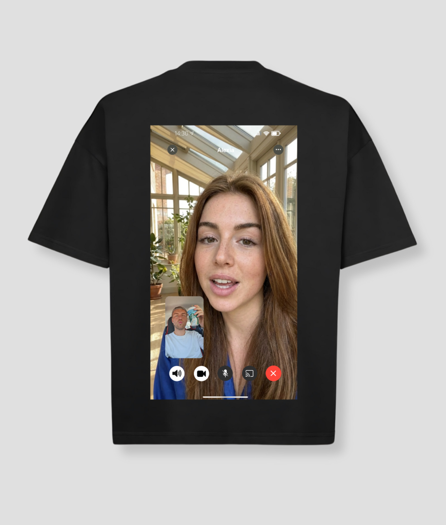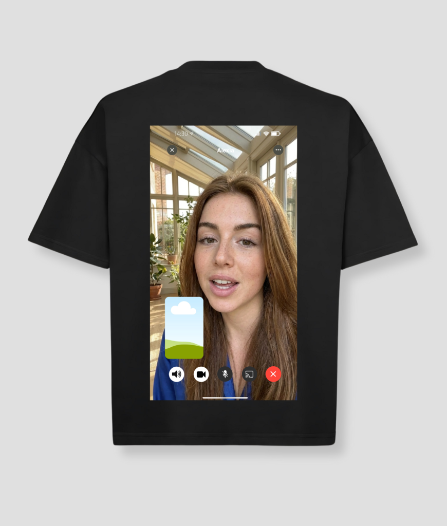 Het ontwerp toont een videobel van Alexia, compleet met een gespreksscherm en een frisse achtergrond. Het is de perfecte manier om humor en originaliteit toe te voegen aan je kleding.