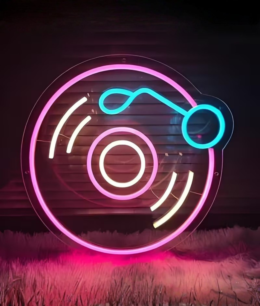 De plaatvorm is strak, modern en vol beweging. De roze ring, witte lijnen en blauwe arm vormen samen een neonlook die bijna lijkt te draaien. Zet hem in je woonkamer, naast je speakers of in je slaapkamer en je hele kamer krijgt een muziekstudio uitstraling waar iedereen jaloers op wordt.