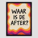 Functionaliteit is noodzaak. Dit is de poster die je eist om je feest-territorium mee te markeren. De korte beschrijving belooft dat het “Geeft je kamer direct een speelse, feestelijke uitstraling”. Het doel is helder: elke gast moet bij binnenkomst direct weten wat de belangrijkste vraag van de avond is. Met de poster schreeuw je de boodschap “WAAR IS DE AFTER?” en neem je de leiding over de nacht.