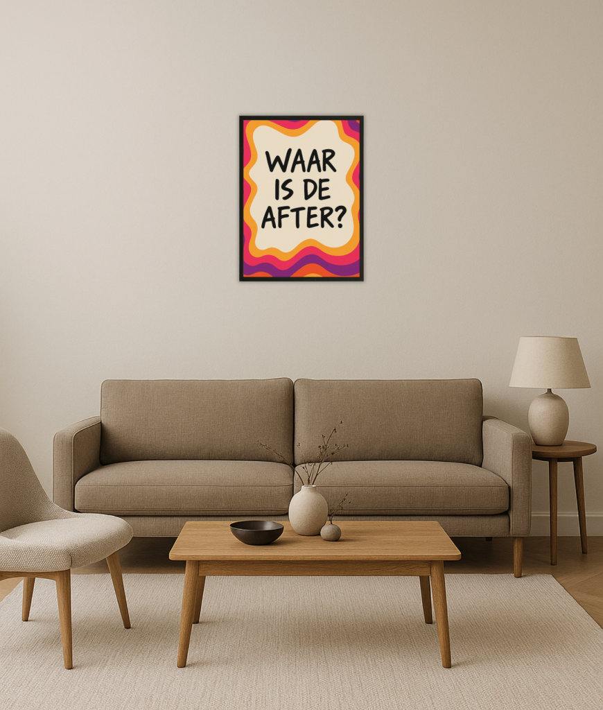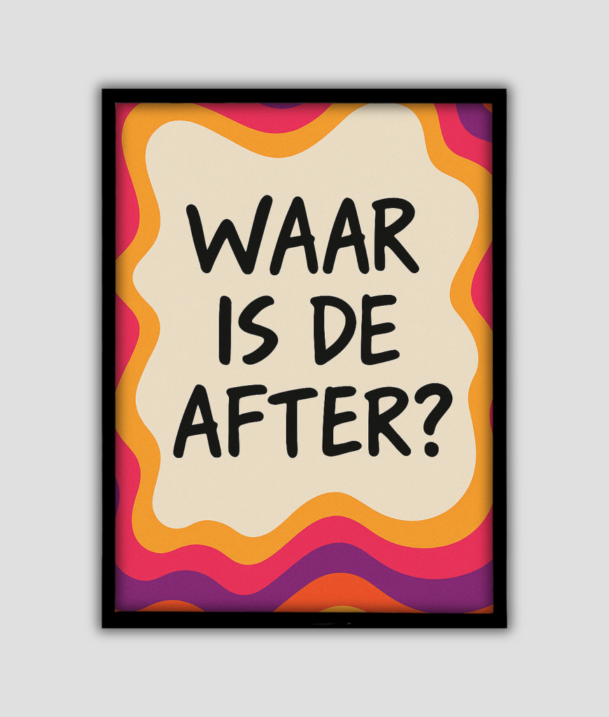 Amigo, dit is de Waar is de after poster. Je zoekt geen subtiliteit en je hebt geen geduld voor twijfel over de volgende locatie. Met de korte tekst “Lijst met de tekst “Waar is de after?” op een kleurrijke retro achtergrond” is de toon direct gezet. Je kiest voor maximale impact die je wilt maken.