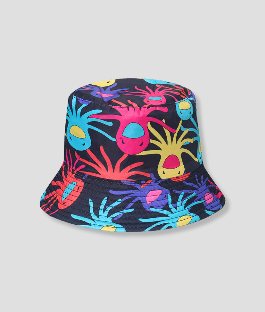Met felle neonkleuren en een abstract patroon, brengt deze hoed energie en een speelse vibe naar je outfit. De opzichtige en levendige figuren zijn perfect voor wie houdt van opvallen en zijn eigen stijl wil uitdragen.