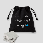 Het zakje wordt geleverd met 10 condooms van hoge kwaliteit. Het voordeel hiervan is: geen kinderen. Het nadeel: geen kinderbijslag.