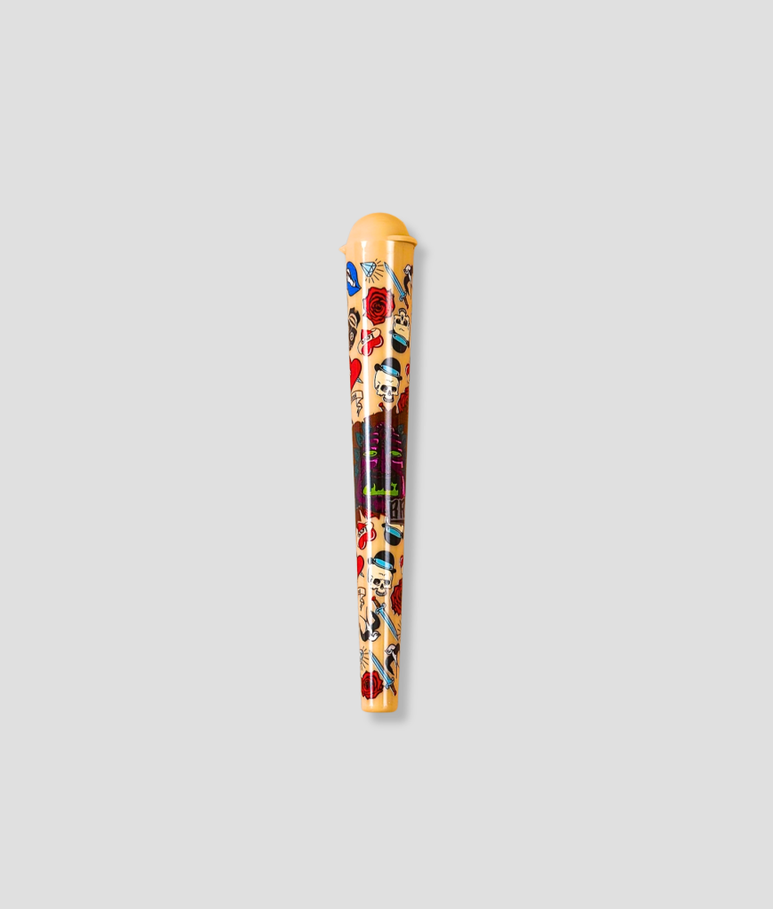 De tube heeft een opvallend design met tattoo elementen zoals rozen, schedels en andere illustraties. Dat geeft hem een unieke look die goed past bij festivals en feestjes.