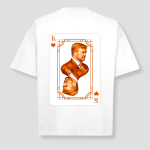 Je krijgt een wit oversized T-shirt met korte mouwen en een losse fit. Op de achterkant staat een grote speelkaart print met een koning en hart symbolen. De stof is licht en zit comfortabel.