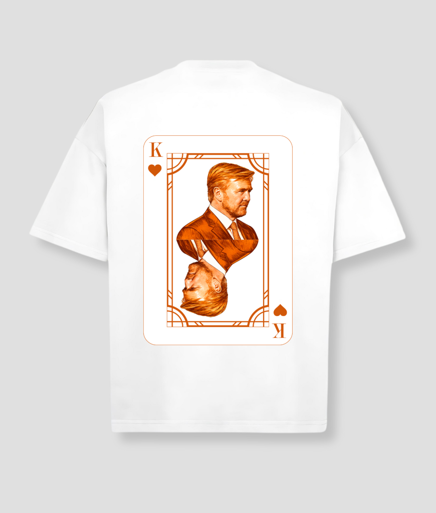 Dit T-shirt heeft een witte basis met een grote speelkaart print op de achterkant. De oranje tinten van de koning zorgen voor contrast en maken het een duidelijke eyecatcher.