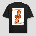Je krijgt een zwart oversized T-shirt met korte mouwen en een losse fit. Op de achterkant staat een grote speelkaart print met een koning en hart symbolen. De stof is licht en zit comfortabel.