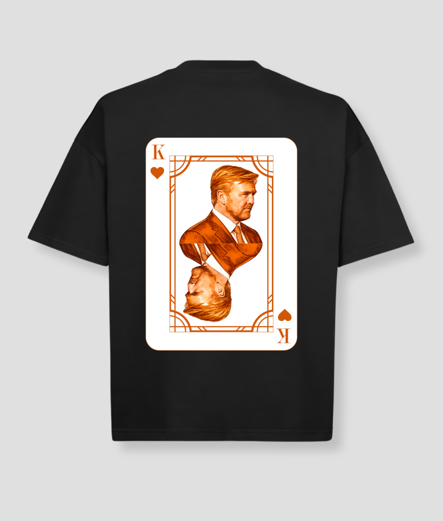 Dit T-shirt heeft een zwarte basis met een grote speelkaart print op de achterkant. De oranje tinten van de koning zorgen voor contrast en maken het een duidelijke eyecatcher.