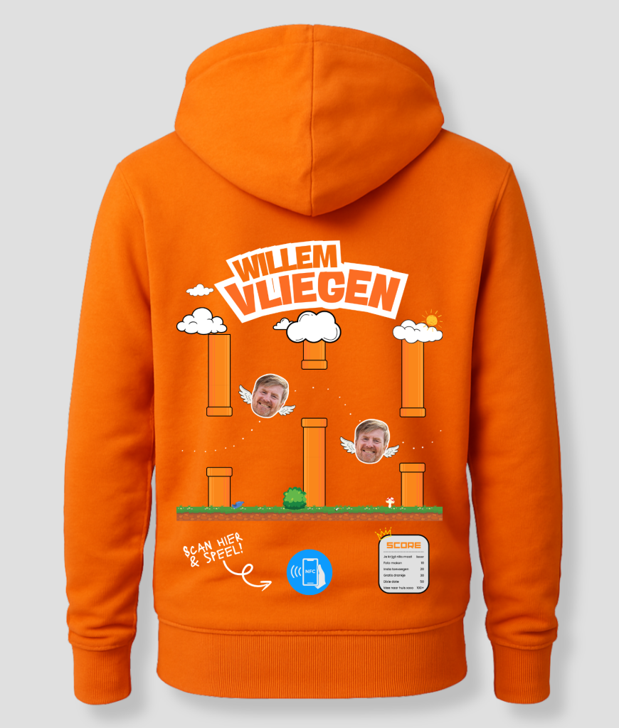 Dit is veruit de leukste hoodie om te dragen deze Koningsdag, en naar feestjes en festivals. Scan met je telefoon de NFC-tag en het spel begint direct op je telefoon. Hoe hoger de score, des te meer je kunt winnen, van een drankje samen tot misschien wel een hele gezellige avond. Veruit ons meest unieke en leukste hoodie!