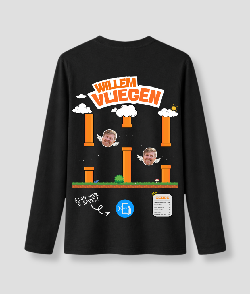 Dit is veruit de leukste longsleeve om te dragen deze Koningsdag, en naar feestjes en festivals. Scan met je telefoon de NFC-tag en het spel begint direct op je telefoon. Hoe hoger de score, des te meer je kunt winnen, van een drankje samen tot misschien wel een hele gezellige avond. Veruit ons meest unieke en leukste longsleeve!