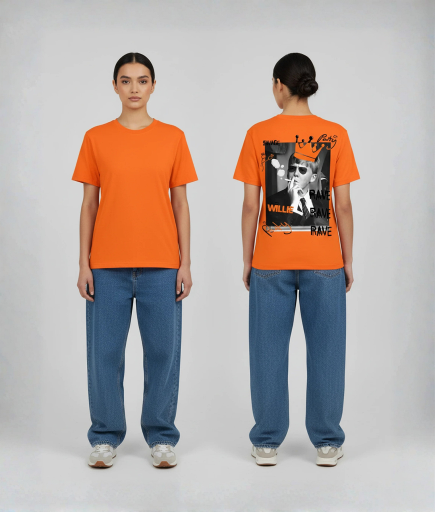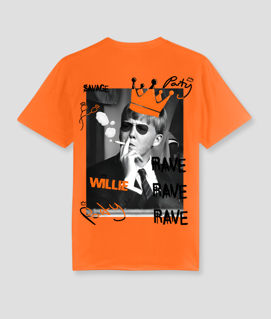 Willie Rave – Voor de feestvierder die Willem liever op de dansvloer ziet dan op de troon. Koningsdag, techno, en je favoriete royal in één shirt.